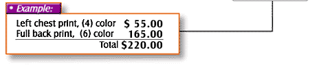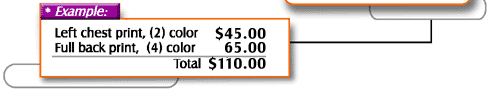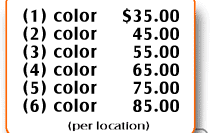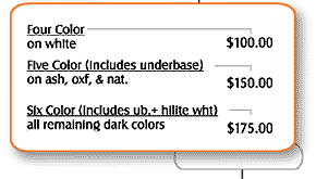 ink colors per each location*. These include flat spot colors with little halftoning. Pricing starts at $35 each, adding $10 for each additional color (over 2) in the design (see chart at left). These